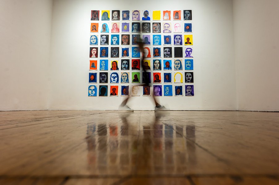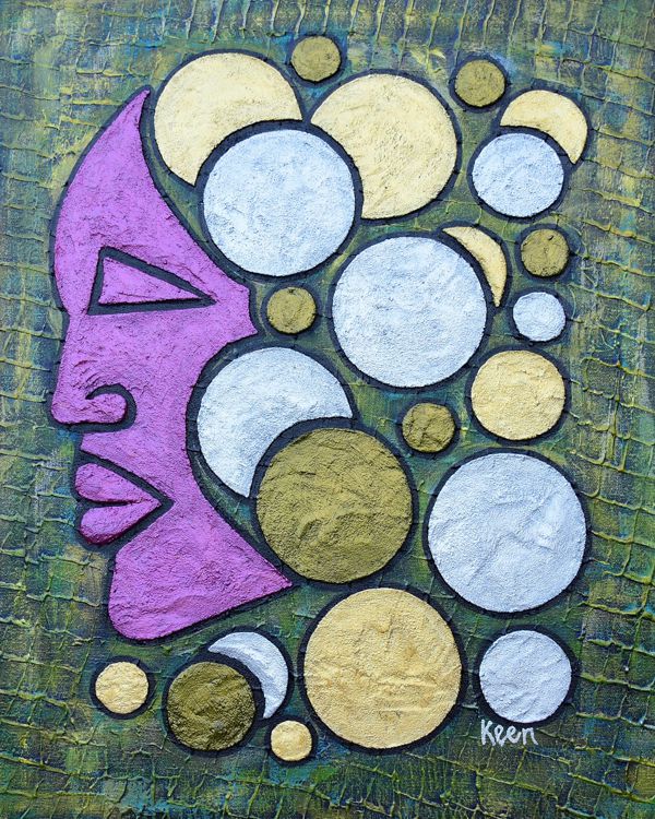 Sheryl Keen's themes include exploring the internal struggles that take place within a person that leads to outward change. She also looks at faces and masks and how we wear each as a survival mechanism.