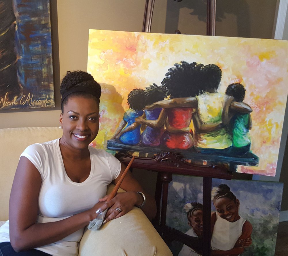 Nicole Alexander is a self-taught visual artist currently residing in Ontario, Canada. Nicole’s paintings in oil, acrylic and watercolour reflect a unique Afro-Caribbean vibe. Having spent her childhood and youth in the two island nation of Trinidad and Tobago, Nicole’s inspiration for her paintings stems from her love of Caribbean dance, poetry, calypso music and most importantly from the beauty of her culture and heritage. Like one of her favourite mentor artists, Elizabeth Catlett, who endured and fought through racial barriers to make a name for herself, Nicole stands by Catlett’s message of creating art for all people to enjoy.