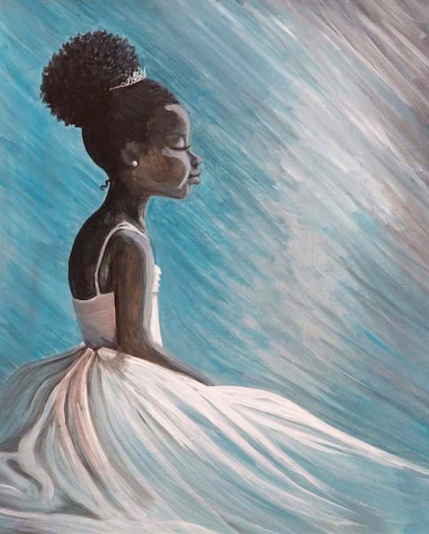 Inspired by the strength, resilience, beauty and faith of my mother and grandmother, I use mixed mediums to create opulent images of Afrocentric womanhood. My aim is for little black girls to look at my paintings and see that their black is beautiful. In 2021, after waking from a dream of my own gallery exhibit, I picked up a paintbrush for the first time and fell deeply in love. The rest of the story is in process.