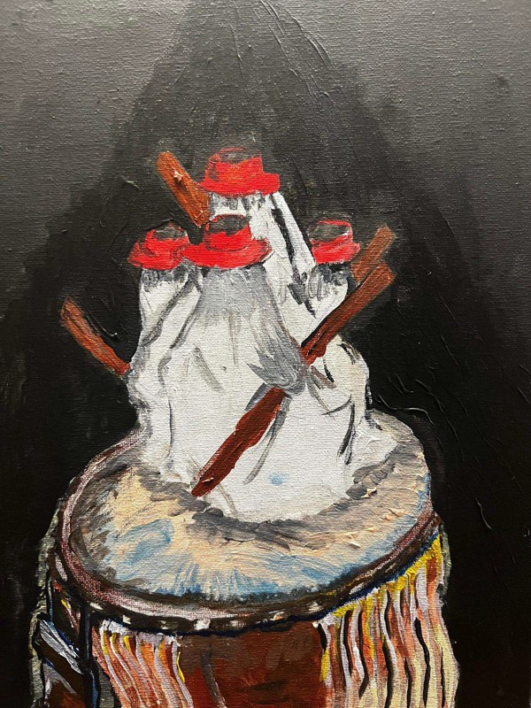In the past I've struggled with imposter syndrome, which causes me to doubt my abilities and wonder why I'm given opportunities that seem to be based more on my race than my skills. I order to show the positive progress and history of black people, I chose a new angle from which to write this piece. In Nigeria's capital city of Lagos, the eyo masquerades (dancing masquerades are a cultural icon. They are revered as a reincarnated souls of the city's founding Yoruba ancestors. I put them on a set of talking drums played at the eyo festival to coax them into the open. I'm trying to convey that our ancestors are pleased with the development of the Black community and the steps we've taken to secure our freedom, from the Black Lives Matter movement to the Endsars protest.